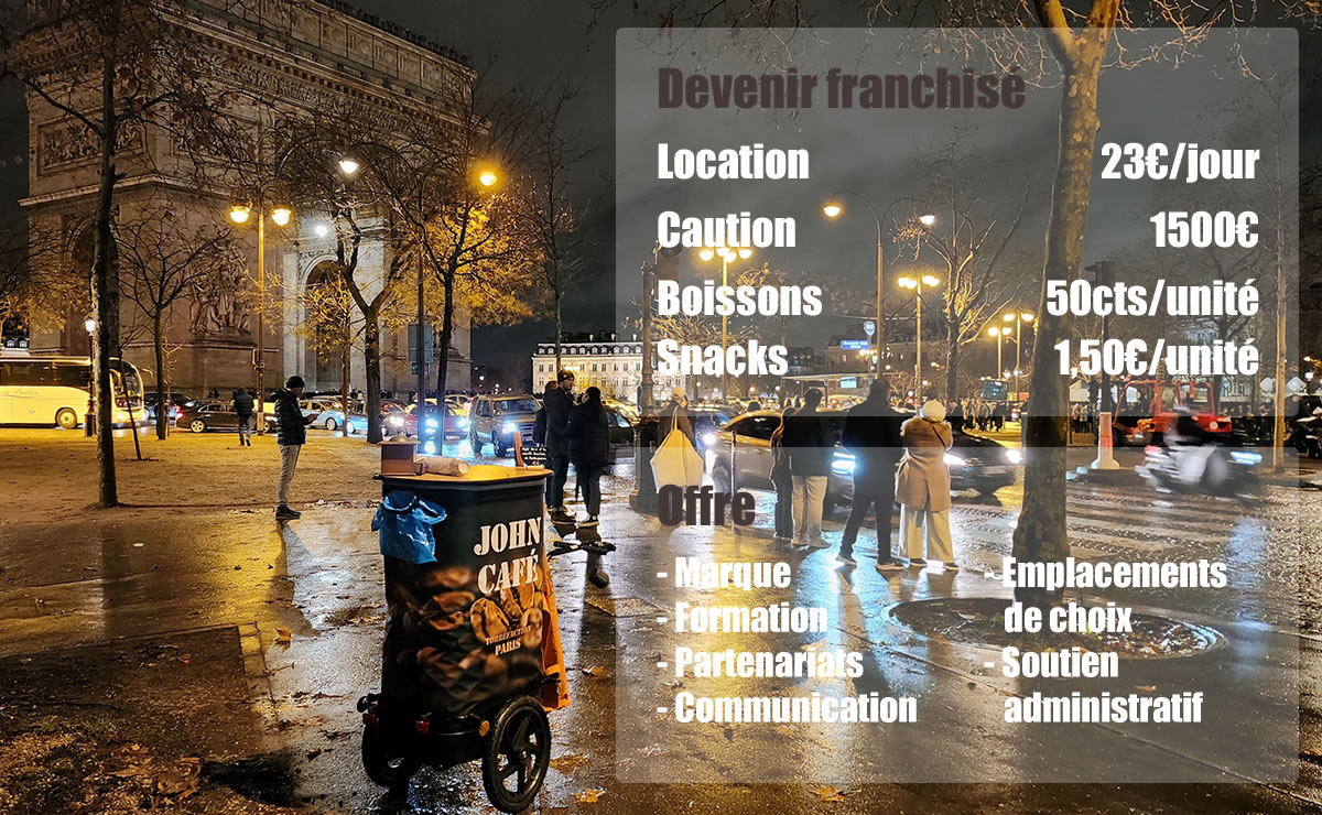 Il n'est pas nécessaire d'acheter un triporteur, nous vous fournissons un kiosk mobile à la location au prix de 23€/jour pour optimiser votre activité de vente de café.